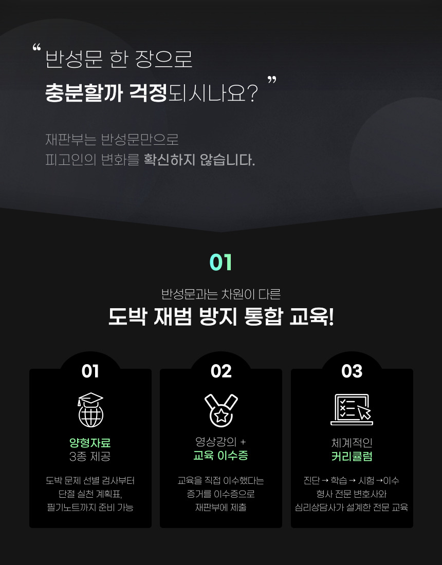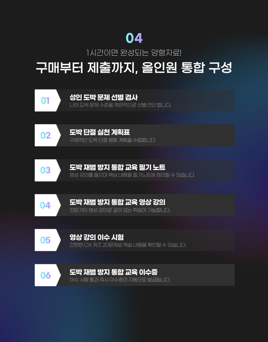 제공 서비스 강의수료증 + 도박 문제 선별 검사 + 도박 단절 실천 계획표 + 필기노트 제공 결제 후 즉시 강의 수강 및 자료 다운로드 가능(수강 기간: 결제일 포함 14일) OX퀴즈 후 즉시 수료증 발급·인쇄 가능