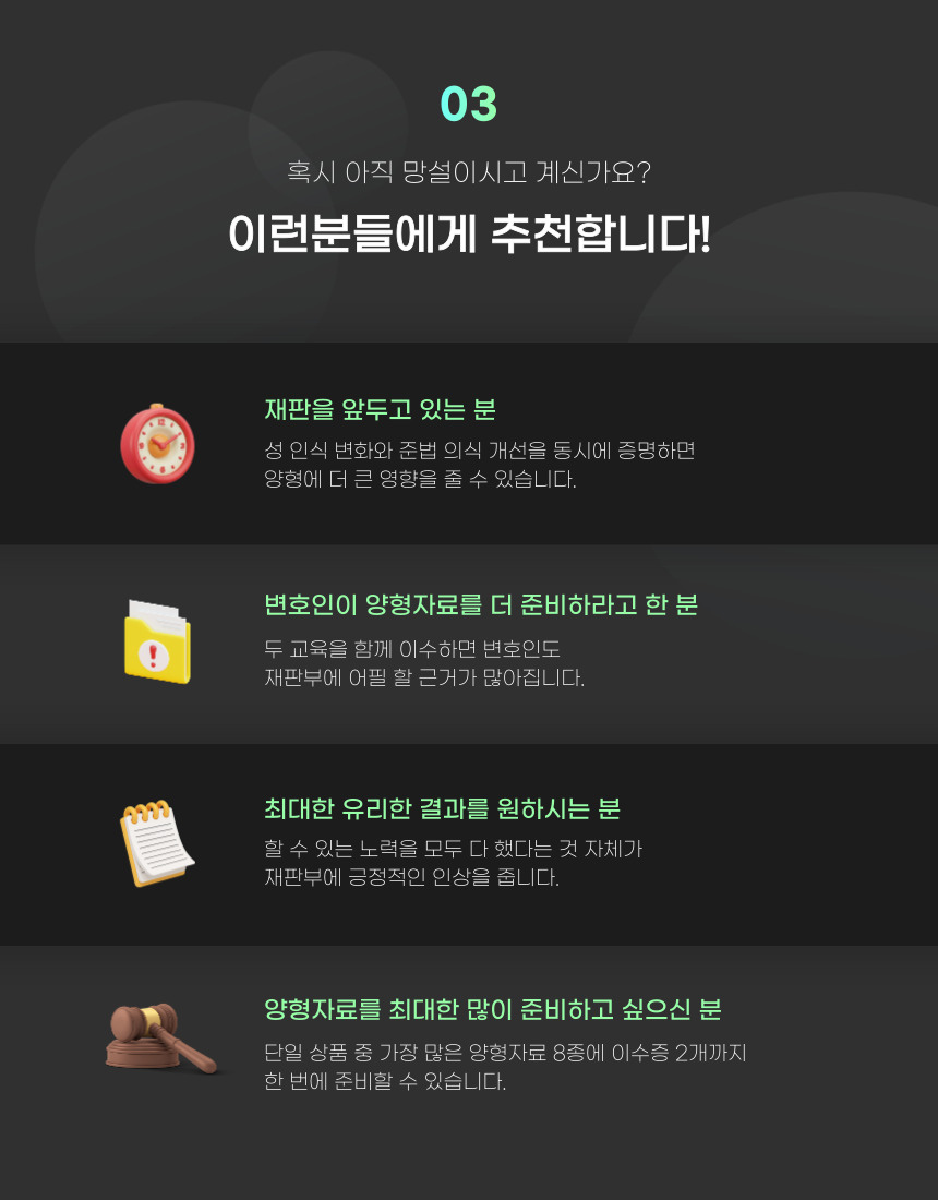 [형사 사건 양형자료] 한국준법심리연구소의 성범죄 재범 방지 & 준법의식 향상 교육 패키지: VOD 강의, 자가진단 검사·해석지, 실천 계획표, 서약서, 이수증 등 법원 제출용 양형자료 완비