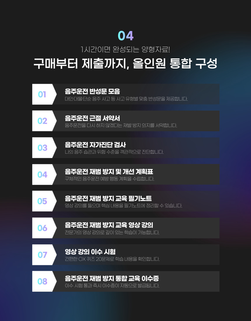 e-강의 수료증 + 음주운전 재범 가능성 자가진단검사 + 음주운전 실천계획표 + 필기노트 제공